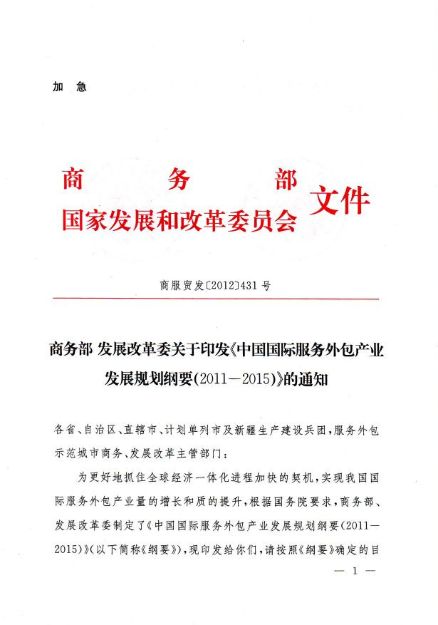 商务部 发展改革委关于印发《中国国际服务外包产业发展规划纲要(2011-2015)》的通知