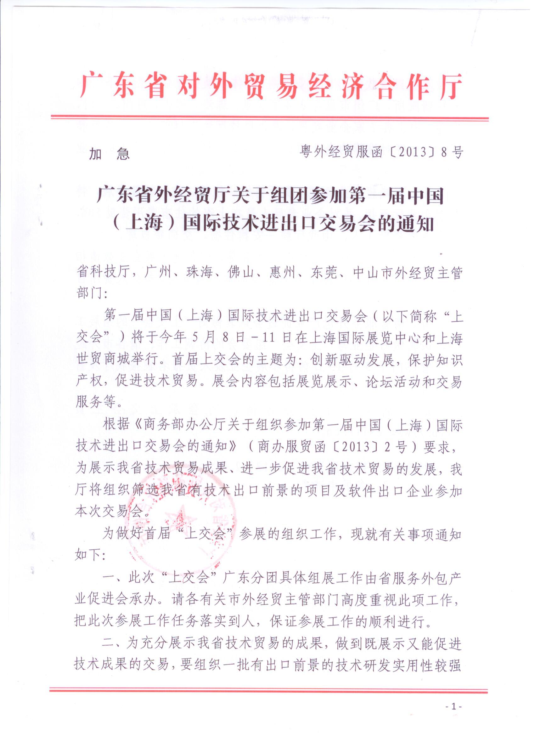 转发:广东省外经贸厅关于组团参加第一届中国(上海)国际技术进出口交易会的通知