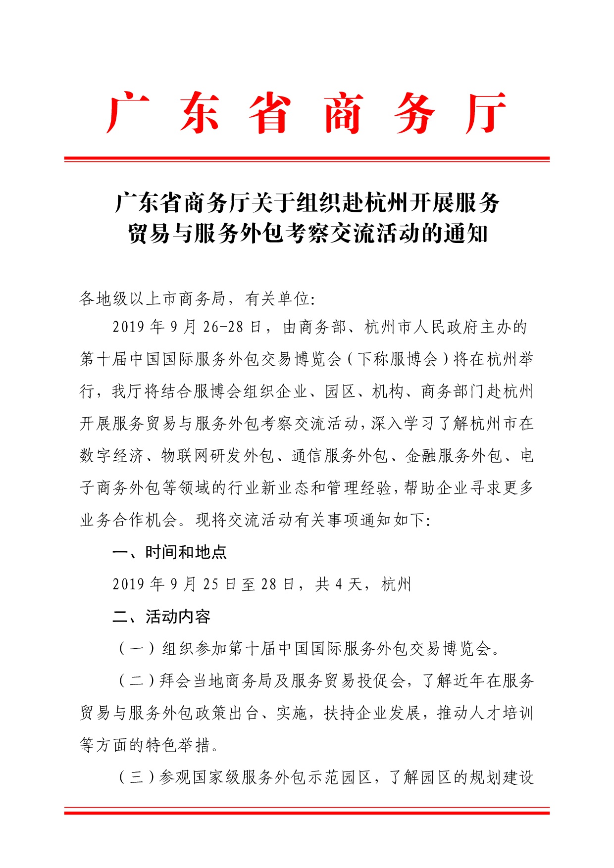 转发 广东省商务厅关于组织赴杭州开展服务贸易与服务外包考察交流活动的通知