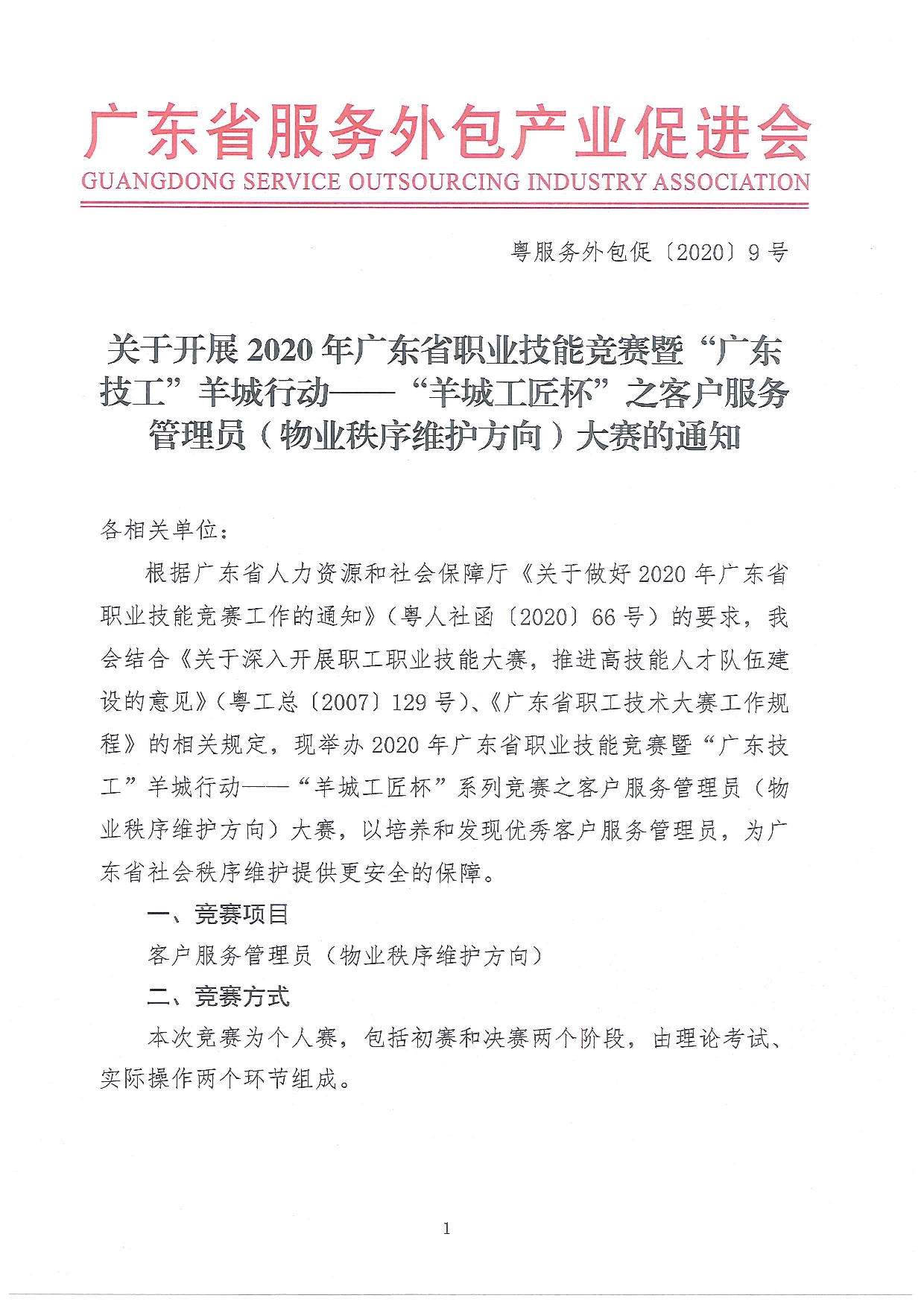 关于开展2020年广东省职业技能竞赛暨 “广东技工”羊城行动——“羊城工匠杯”之客户服务管理员(物业秩序维护方向)大赛的通知